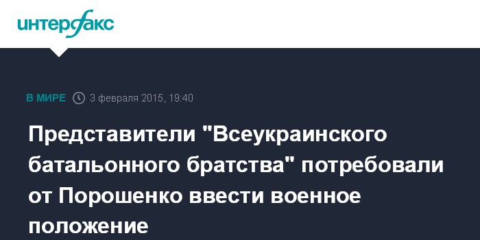 Москва. 3 февраля. INTERFAX.RU - Примерно полсотни представителей "Всеукраинского батальонного братства" во вторник вечером пришли к зданию администрации президента Украины на Банковой улице в Киеве на акцию с требованием к Петру Порошенко ввести военное положение в стране.