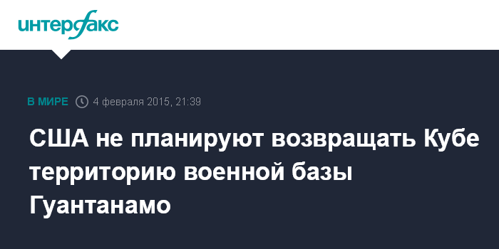 Москва. 4 февраля. INTERFAX.RU - США не намерены отдавать Кубе территорию военно-морской базы Гуантанамо, как того требует Гавана, заявила помощница госсекретаря США по делам Западного полушария Роберта Джейкобсон.