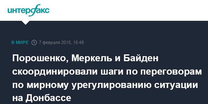 Москва. 7 февраля. INTERFAX.RU - Президент Украины Петр Порошенко, федеральный канцлер Германии Ангела Меркель и вице-президент США Джо Байден на трехсторонних переговорах в Мюнхене обсудили развитие переговоров по мирному урегулированию ситуации на Донбассе и отметили необходимость прекращения огня.