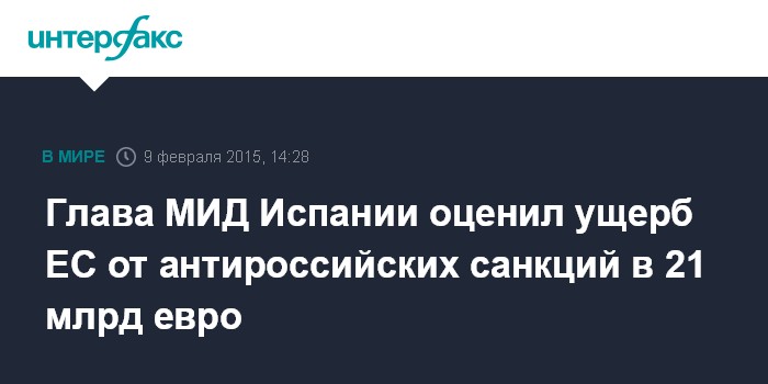 Москва. 9 февраля. INTERFAX.RU - Ограничительные меры в отношении России стоили Евросоюзу 21 млрд евро, заявил в понедельник глава испанского МИД Хосе Мануэль Гарсия-Маргальо.