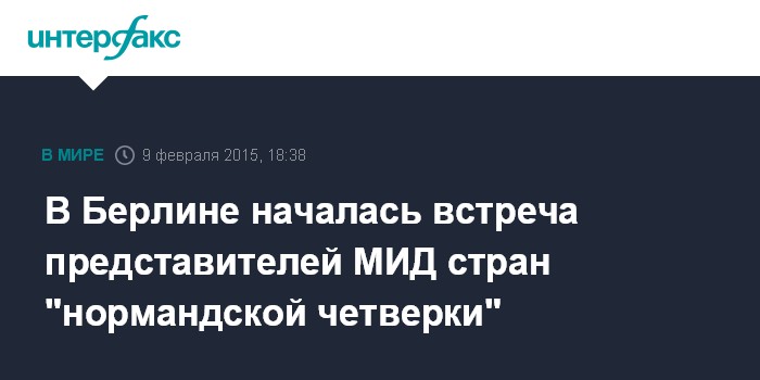 Москва. 9 февраля. INTERFAX.RU - Встреча представителей МИД Украины, Германии, Франции и России по урегулированию конфликта на востоке Украины началась в эти минуты в Берлине, сообщил дипломатический источник.