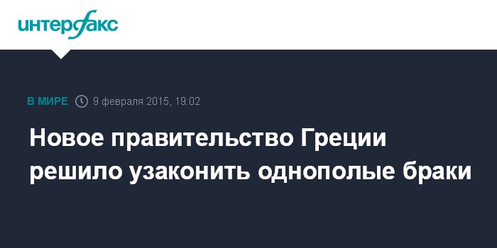 Москва. 9 февраля. INTERFAX.RU - Новое правительство Греции намерено придать законный статус однополым парам, сообщил в понедельник в парламенте министр юстиции Николаос Параскевопулос, сообщает Associated Press.