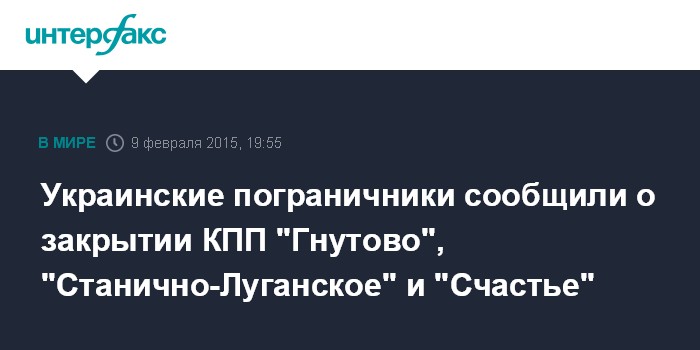 Москва. 9 февраля. INTERFAX.RU - Государственная пограничная служба Украины сообщает о приостановке пропуска граждан и транспорта в контрольно-пропускных пунктах "Гнутово" (Донецкая обл.), "Станично-Луганское" и "Счастье" (Луганская обл.) из-за обстрелов.