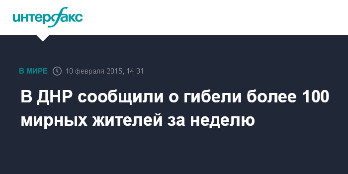 Москва. 10 февраля. INTERFAX.RU - В результате боевых действий на территории самопровозглашенной Донецкой народной республики на прошлой неделе погибли более 100 человек, сообщила уполномоченный по правам человека в ДНР.