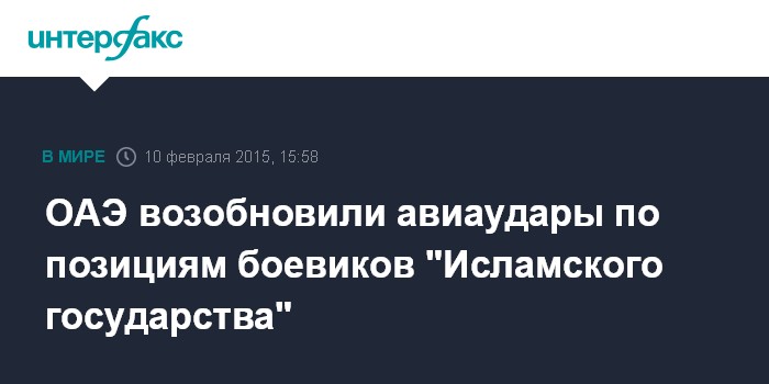 Москва. 10 февраля. INTERFAX.RU - Объединенные Арабские Эмираты возобновили удары с воздуха по позициям террористической группировки "Исламское государство", сообщили арабские СМИ.
