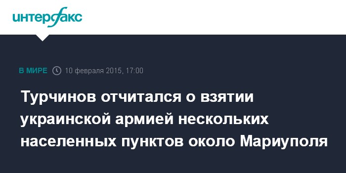 Москва. 10 февраля. INTERFAX.RU - Подразделения Национальной гвардии при поддержке Вооруженных сил Украины прорвали позиции противника в районе Мариуполя и заняли несколько населенных пунктов, сообщил секретарь Совета нацбезопасности и обороны Украины Александр Турчинов, находящийся на месте боевых действий.