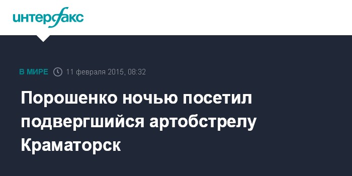 Москва. 11 февраля. INTERFAX.RU - Президент Украины Петр Порошенко минувшей ночью посетил город Краматорск в Донецкой области, который накануне подвергся артобстрелу со стороны ополченцев, сообщает пресс-секретарь главы государства Святослав Цеголко.