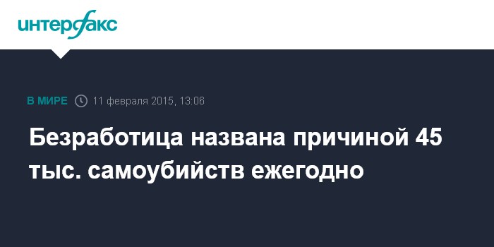 Москва. 11 февраля. INTERFAX.RU - Безработица становится причиной около 45 тысяч самоубийств ежегодно, почти пятой части всех суицидов, показало исследование ученых из университета Цюриха. Об этом говорится в исследовании, опубликованном в журнале Lancet Psychiatry .