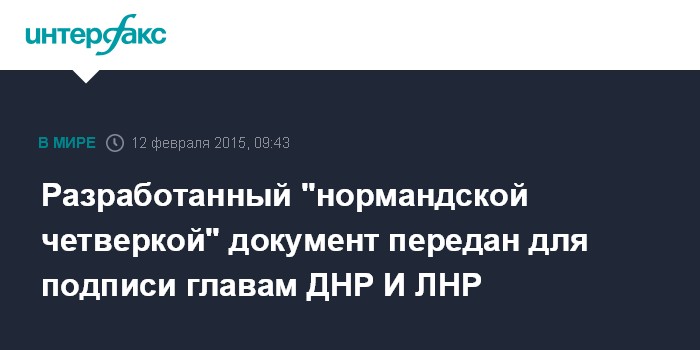 Москва. 12 февраля. INTERFAX.RU - Главы ДНР и ЛНР Александр Захарченко и Игорь Плотницкий, приехавшие на заседание контактной группы, как ожидается, поставят свои подписи под проектом документа, разработанным на встрече лидеров "нормандской четверки", сообщил "Интерфаксу" источник, знакомый с ходом переговоров.