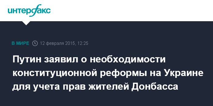 Москва. 12 февраля. INTERFAX.RU - Осуществление минских договоренностей предусматривает конституционную реформу, в которой будут учтены законные права жителей Донбасса, заявил президент РФ Владимир Путин по окончании переговоров в "нормандском формате".