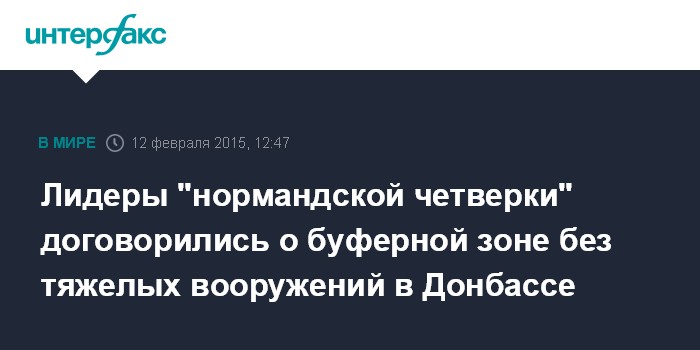 Москва. 12 февраля. INTERFAX.RU - Президент Украины Петр Порошенко заявил, что в ходе переговоров в "нормандском формате" в Минске была достигнута договоренность об отводе тяжелых вооружений сторонами конфликта в Донбассе. В итоге планируется создать 50-километровую буферную зону.