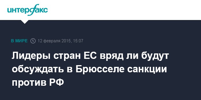 Москва. 12 февраля. INTERFAX.RU - Главы государств и правительств стран ЕС на саммите в четверг в Брюсселе вряд ли будут обсуждать вопрос о санкциях против РФ, заявила глава европейской дипломатии Федерика Могерини.