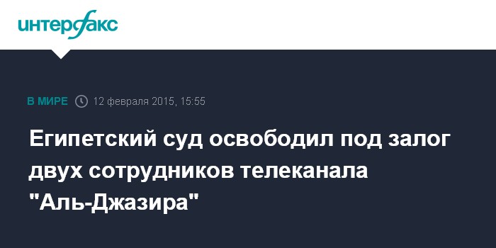 Москва. 12 февраля. INTERFAX.RU - Суд Египта в четверг постановил отпустить на свободу под залог канадского журналиста Мухаммеда Фахима и продюсера Бахера Мухаммеда, работающих на телеканал "Аль-Джазира", сообщает агентство Associaded Press.
