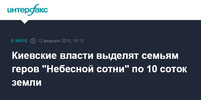 Москва. 12 февраля. INTERFAX.RU - Семьям 24-х киевлян, погибших год назад в ходе протестов на Майдане, будет выделено по 10 соток земли.