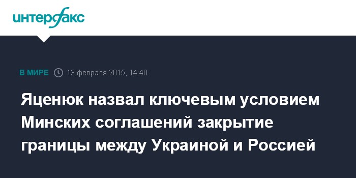 Москва. 13 февраля. INTERFAX.RU - Премьер-министр Украины Арсений Яценюк считает, что ключевым условием выполнения Минских соглашений будет закрытие границы между Украиной и Россией.