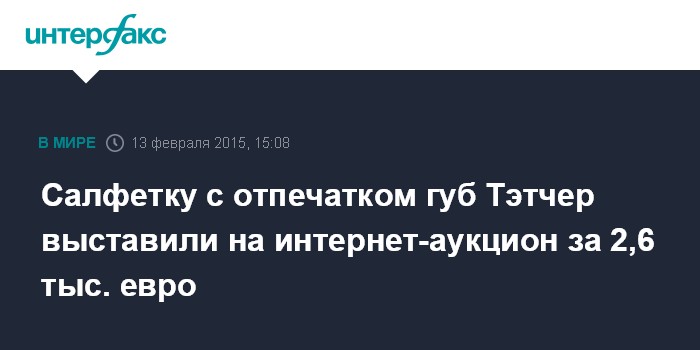 Москва. 13 февраля. INTERFAX.RU - Салфетку с отпечатком красной помады экс-премьера Великобритании Маргарет Тэтчер выставили на продажу в интернете. Такое предложение опубликовал интернет-аукцион Picollecta