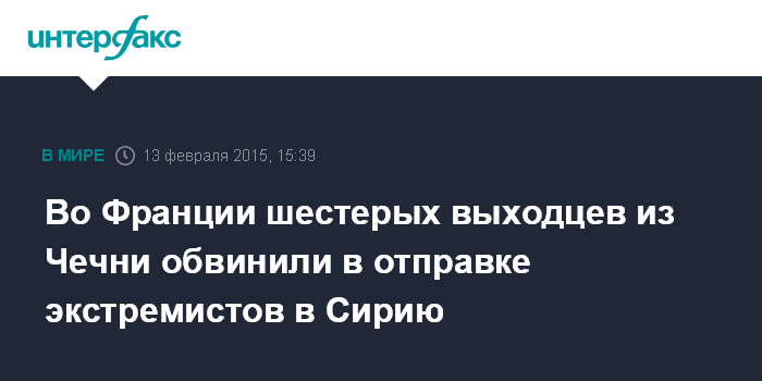 Москва. 13 февраля. INTERFAX.RU - Судебные власти Франции предъявили шестерым выходцам из Чечни обвинение в организации отправки экстремистов на войну в Сирию, сообщает парижская газета Le Figaro.