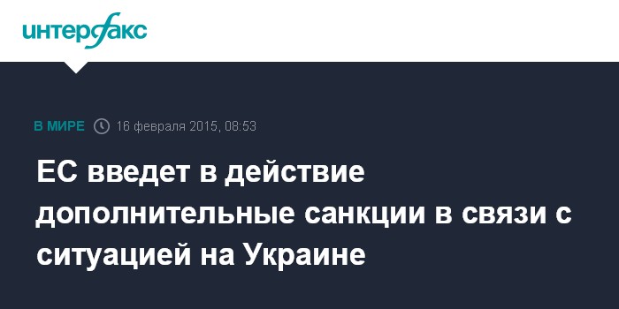 Москва. 16 февраля. INTERFAX.RU - В соответствии с постановлением Совета ЕС от 9 февраля, в понедельник будут опубликованы и вступят в силу новые индивидуальные санкции Евросоюза в связи с украинской ситуацией, которые будут распространяться на 19 физических и девять юридических лиц.