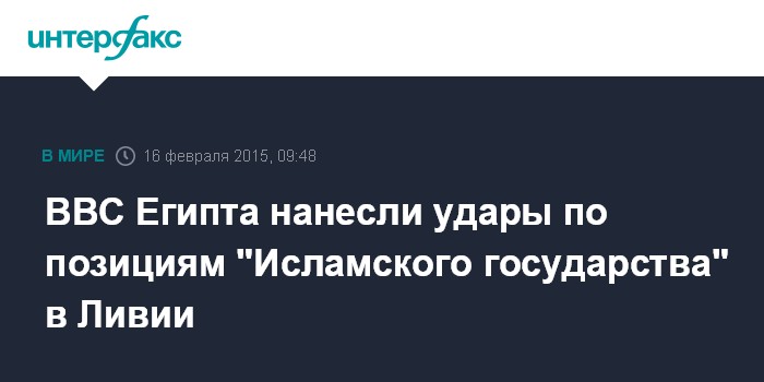 Москва. 16 февраля. INTERFAX.RU - ВВС Египта подвергли бомбардировке позиции боевиков из "Исламского государства" (ИГ) в Ливии, передает в понедельник государственное египетское телевидение.