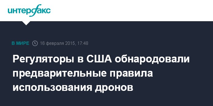 Москва. 16 февраля. INTERFAX.RU - Управление гражданской авиации США (Federal Aviation Administration, FAA) обнародовало предварительный свод правил, которые в будущем будут регулировать коммерческое использование управляемых летательных аппаратов (дронов), сообщает агентство Bloomberg.