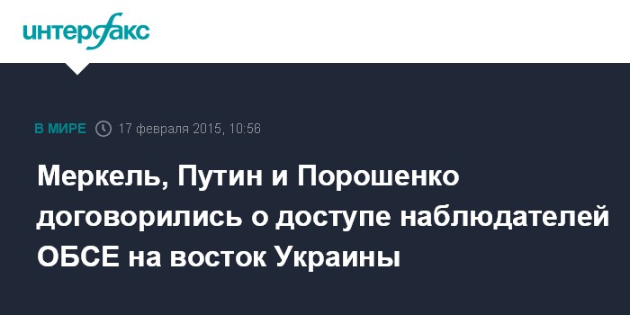 Москва. 17 февраля. INTERFAX.RU - Лидеры Германии, России и Украины договорились о конкретных мерах мониторинга наблюдателями ОБСЕ соблюдения режима прекращения огня на востоке Украины, отмечается в коммюнике правительства Германии, опубликованном во вторник.