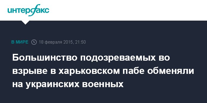 Москва. 18 февраля. INTERFAX.RU - Большинство подозреваемых в организации взрыва в харьковском рок-пабе "Стена" обменяли на украинских военнослужащих, взятых ополченцами в плен на востоке Украины, сообщил начальник управления СБУ в Харьковской области Александр Пивовар.