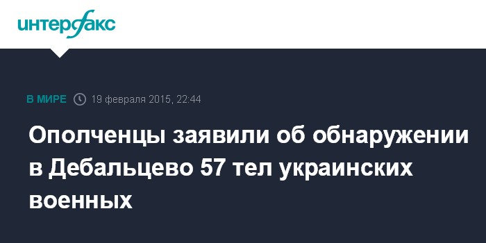 Москва. 19 февраля. INTERFAX.RU - Ополченцы ДНР сообщили об обнаружении 57 тел военнослужащих украинской армии в районе города Дебальцево. По словам представителя Минобороны самопровозглашенной Донецкой народной республики Эдуарда Басурина, там же находились в исправном состоянии 13 артиллерийских систем и минометов, 28 танков, 63 БТР и БМП, около тысячи единиц стрелкового оружия, 39 складов с боеприпасами и два вагона со стрелковым вооружением.