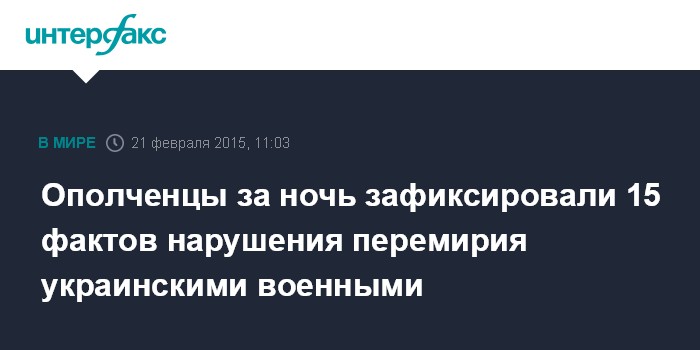 Москва. 21 февраля. INTERFAX.RU - Украинские военные минувшей ночью нарушили режим прекращения огня 15 раз, заявляют в минобороны самопровозглашенной Донецкой народной республики.