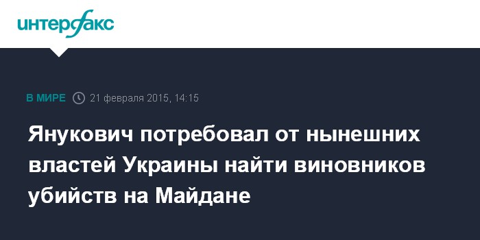 Москва. 21 февраля. INTERFAX.RU - Экс-президент Украины Виктор Янукович считает, что нынешние украинские власти не заинтересованы в объективном расследовании убийств людей на киевском Майдане год назад и поиске истинных виновников трагедии.