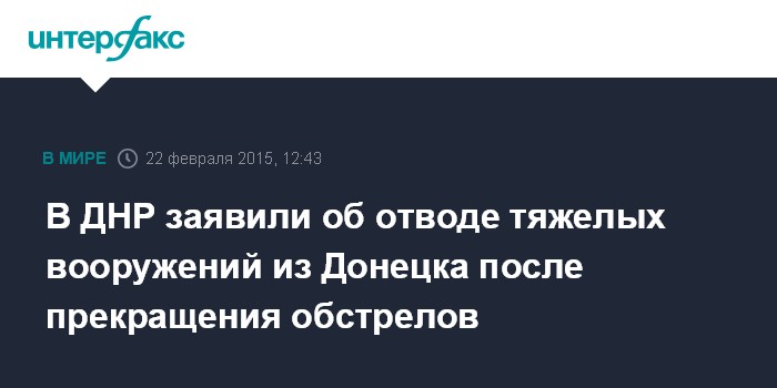 Москва. 22 февраля. INTERFAX.RU - Отвод тяжелых вооружений из Донецка начнется не раньше окончания обстрелов, в процессе будет применяться "секторальный подход", заявил в воскресенье представитель минобороны самопровозглашенной ДНР Эдуард Басурин.