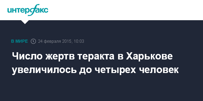 Москва. 24 февраля. INTERFAX.RU - Число жертв воскресного теракта в Харькове увеличилось до четырех человек, сообщил советник главы МВД Украины, народный депутат Антон Геращенко.