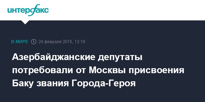 Москва. 24 февраля. INTERFAX.RU - Первый вице-спикер Милли Меджлиса (парламента) Азербайджана Зияфет Аскеров выступает за предоставление Россией азербайджанской столице звания Города-Героя.