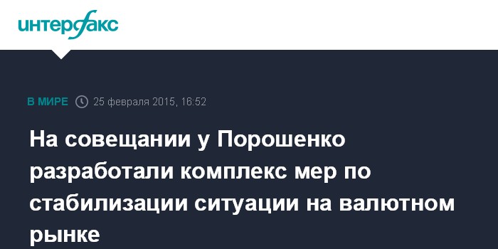 Москва. 25 февраля. INTERFAX.RU - Комплекс мер для стабилизации ситуации на валютном рынке был наработан на совещании у президента Украины Петра Порошенко с участием глав Минфина и Нацбанка, премьером и спикером Рады.