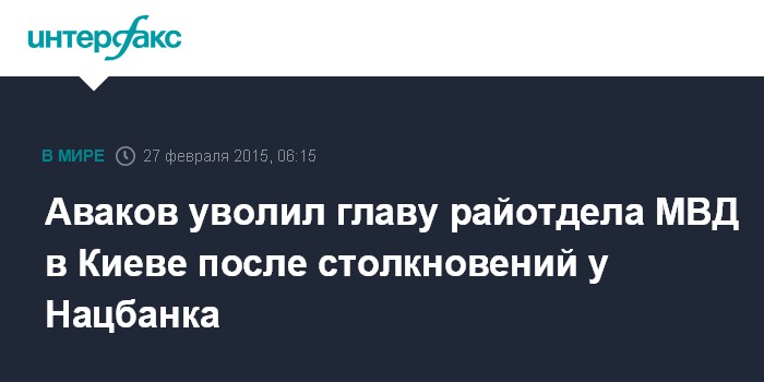 Москва. 27 февраля. INTERFAX.RU - По итогам "беглого разбирательства" глава МВД Украины Арсен Аваков решил уволить руководителя Печерского райотдела милиции Киева, его заместитель по общественной безопасности - отстранен до выводов комиссии по расследованию. Об этом министр написал в своем фейсбуке.