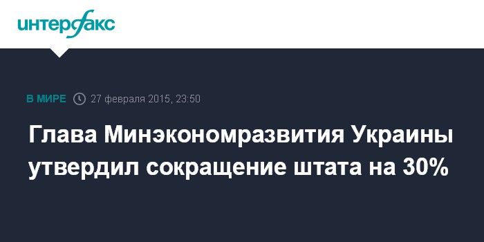 Москва. 27 февраля. INTERFAX.RU - Министр экономического развития и торговли Украины Айварас Абромавичус 26 февраля подписал приказ о сокращении штата министерства на 30% и планирует сократить его еще на 20% осенью.