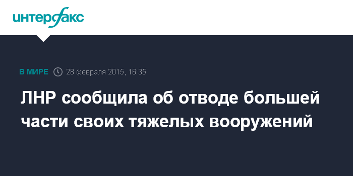 Москва. 28 февраля. INTERFAX.RU - Формирования самопровозглашенной Луганской народной республики отвели 80% тяжелых вооружений, сообщают СМИ ЛНР.