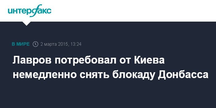 Москва. 2 марта. INTERFAX.RU - Киев должен незамедлительно снять блокаду Донбасса и восстановить экономические связи с регионом; в Москве рассчитывают на помощь ОБСЕ, ООН и Международного комитета Красного Креста в этом вопросе, заявил глава МИД РФ Сергей Лавров.