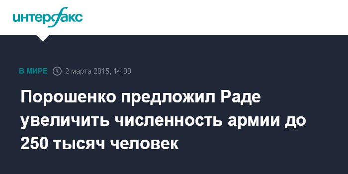 Москва. 2 марта. INTERFAX.RU - Президент Украины Петр Порошенко внес в Верховную раду проект закона о численности вооруженных сил, в соответствии с которым их предельная численность увеличивается до 250 тыс человек, в том числе 204 тысяч военнослужащих.
