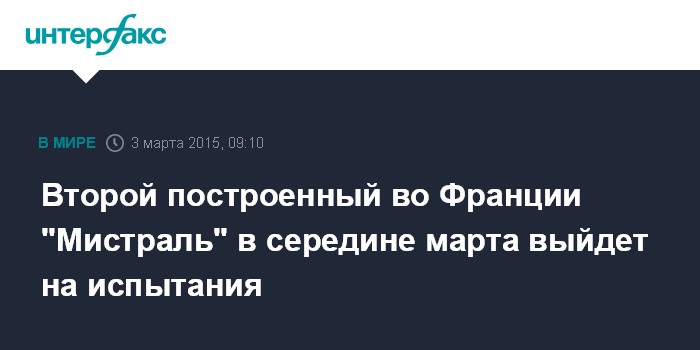 Москва. 3 марта. INTERFAX.RU - Десантный вертолетоносный корабль-док (ДВКД) "Севестополь" типа "Мистраль" - второй ДВКД из числа построенных на верфях компании STX France в Сен-Назере для ВМФ России - в середине марта впервые выйдет в море на испытания, сообщили в вторник "Интерфаксу" в кораблестроительной отрасли.