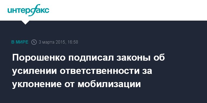 Москва. 3 марта. INTERFAX.RU - Президент Украины Петр Порошенко подписал несколько законов, которые усиливают ответственность военнослужащих и мобилизованных, сообщает пресс-служба главы государства.