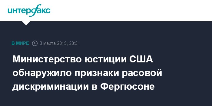 Москва. 3 марта. INTERFAX.RU - Министерство юстиции США подготовило доклад о случаях проявления расовой дискриминации в полиции и муниципальном суде города Фергюсона в штате Миссури, сообщило во вторник агентство Associated Press со ссылкой на источники, знакомые с текстом доклада.