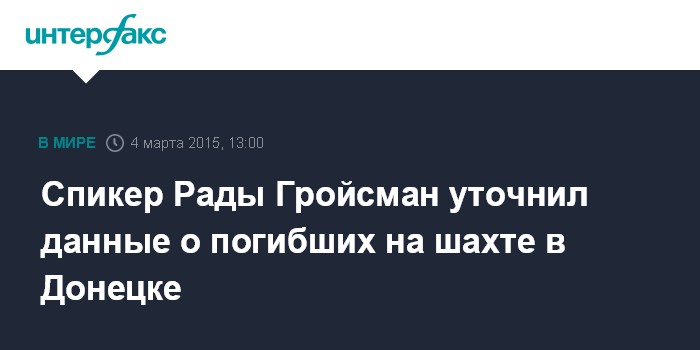 Москва. 4 марта. INTERFAX.RU - Председатель Верховной рады Украины Владимир Гройсман уточнил, что по данным на текущий момент на шахте им. Засядько в Донецке, где в среду утром произошла авария, погиб один человек. Судьба еще 32 горняков остается неизвестной.