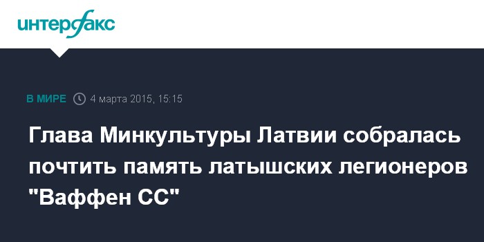 Москва. 4 марта. INTERFAX.RU - Министр культуры от Нацобъединения Даце Мелбарде (Dace Melbarde) намерена 16 марта отправиться на Лестенское (Lestenе) кладбище, где похоронены бойцы Латышского легиона "Ваффен СС".