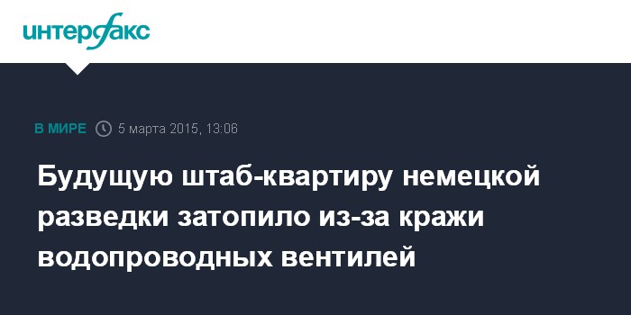 Москва. 5 марта. INTERFAX.RU - Полиция ФРГ обнаружила, что неизвестный демонтировал и унес водопроводные вентили из строящегося в Берлине здания Федеральной разведывательной службы (БНД) Германии, что привело к масштабному затоплению, сообщает агентство AP.
