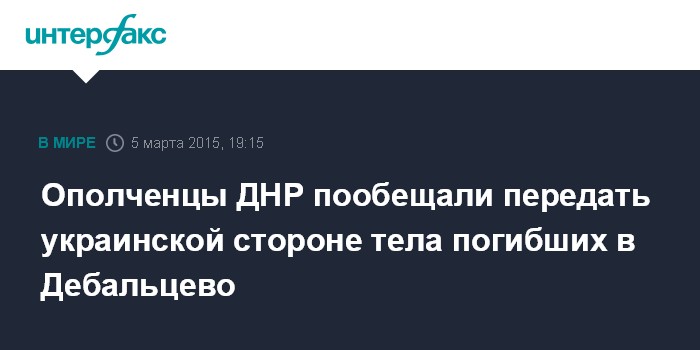 Москва. 5 марта. INTERFAX.RU - Ополченцы самопровозглашенной Донецкой народной республики обещают в ближайшие дни передать украинской стороне тела погибших в Дебальцево в одностороннем порядке.