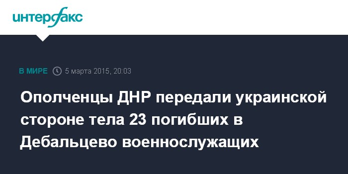 Москва. 5 марта. INTERFAX.RU - Передача тел 23 погибших в Дебальцево украинских военных завершилась в четверг вечером в Донецке.