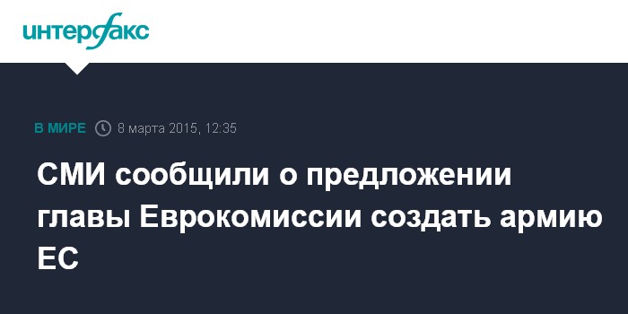 Москва. 8 марта. INTERFAX.RU - Глава Еврокомиссии Жан-Клод Юнкер высказался за создание армии Евросоюза, которая могла бы реагировать на угрозы безопасности стран-членов и соседних с ЕС государств, сообщает веб-сайт немецкого издания Welt am Sonntag.