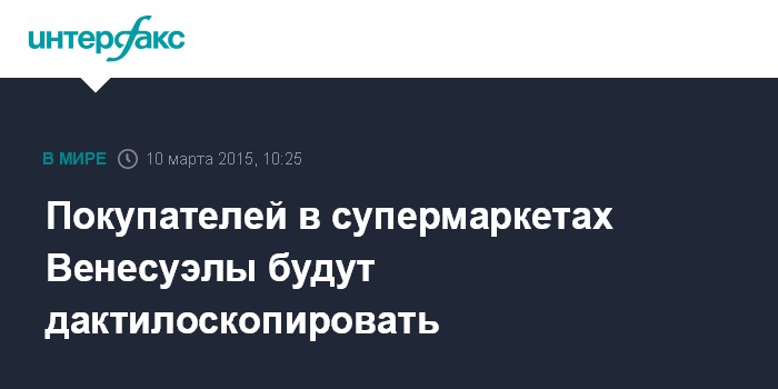 Москва. 10 марта. INTERFAX.RU - Венесуэла планирует установить в супермаркетах по всей стране около 20 тыс. сканеров для считывания отпечатков пальцев покупателей, пишет The Wall Street Journal.