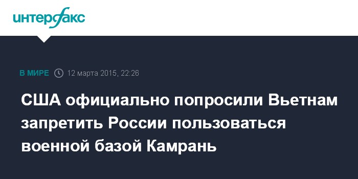 Москва. 12 марта. INTERFAX.RU - США обратились к Вьетнаму с просьбой запретить России использовать базу Камрань для дозаправки самолетов из-за беспокойства, что эти действия способны нанести ущерб безопасности в этом районе, сообщила в четверг представитель госдепа Джен Псаки.
