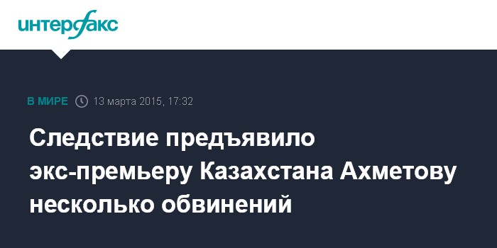 Москва. 13 марта. INTERFAX.RU - Бывшему премьер-министру Казахстана Серику Ахметову официально предъявлено обвинение в шести преступлениях по четырем статьям Уголовного кодекса, сообщили в пятницу агентству "Интерфакс" в следственном департаменте госагентства по делам госслужбы и противодействию коррупции.